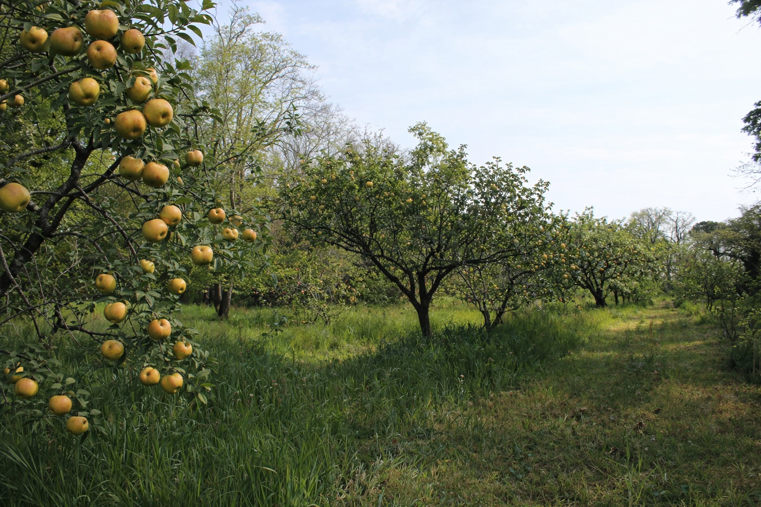 The orchard extends around the Abbey, where fruit trees grow in a balanced and natural environment.